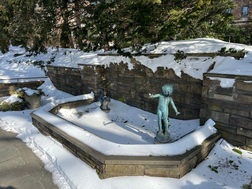 I then walked through the entire gardens stopping in various gardens to see what they looked like topped with snow. My first stop was the Shakespeare Gardens and I marveled at the elegance of the snow covered fountain I like so much in the Spring. The variety of the colors of this garden are waiting just under the snow for the warmer months.