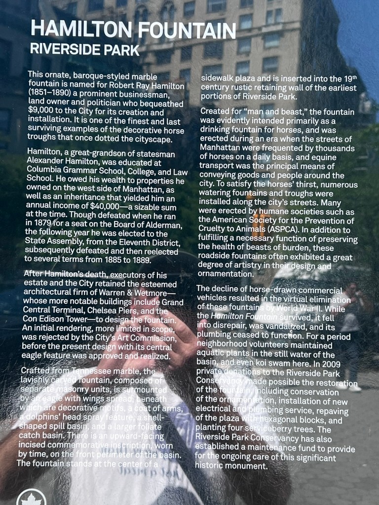 The monument lies at the threshold of the Riverside Park and is one of a sequence of civic monuments along Riverside Drive honoring people of historical significance (NYC Parks.org). It’s a nice place to just relax and watch the world go by. This is also the end of Riverside Park which ends at West 72nd Street.