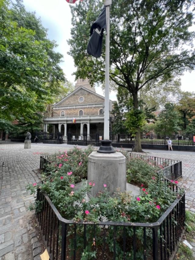 We walked around the grounds and saw other family crypts around the property that were not covered with tables. Some were family members of the extended Stuyvesant family (those who married into it like most colonial families of wealth did) and other prominent families of the church like the Fish’s, Winthrop’s and the Tompkins, whose names are known throughout the City and New York State.