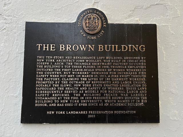 The Brown Building is now part of the New York University campus containing the Chemistry Department. When it was built between 1900-01, the iron and steel building was designed by architect John Woolley in the neo-Renaissance style. It was named at that time the Asch Building after its owner, Joseph J. Asch. The building was known for their fireproof rooms which is why many garment makers liked the building including the Triangle Shirtwaist Factory, which occupied the top three floors of the building (Wiki).