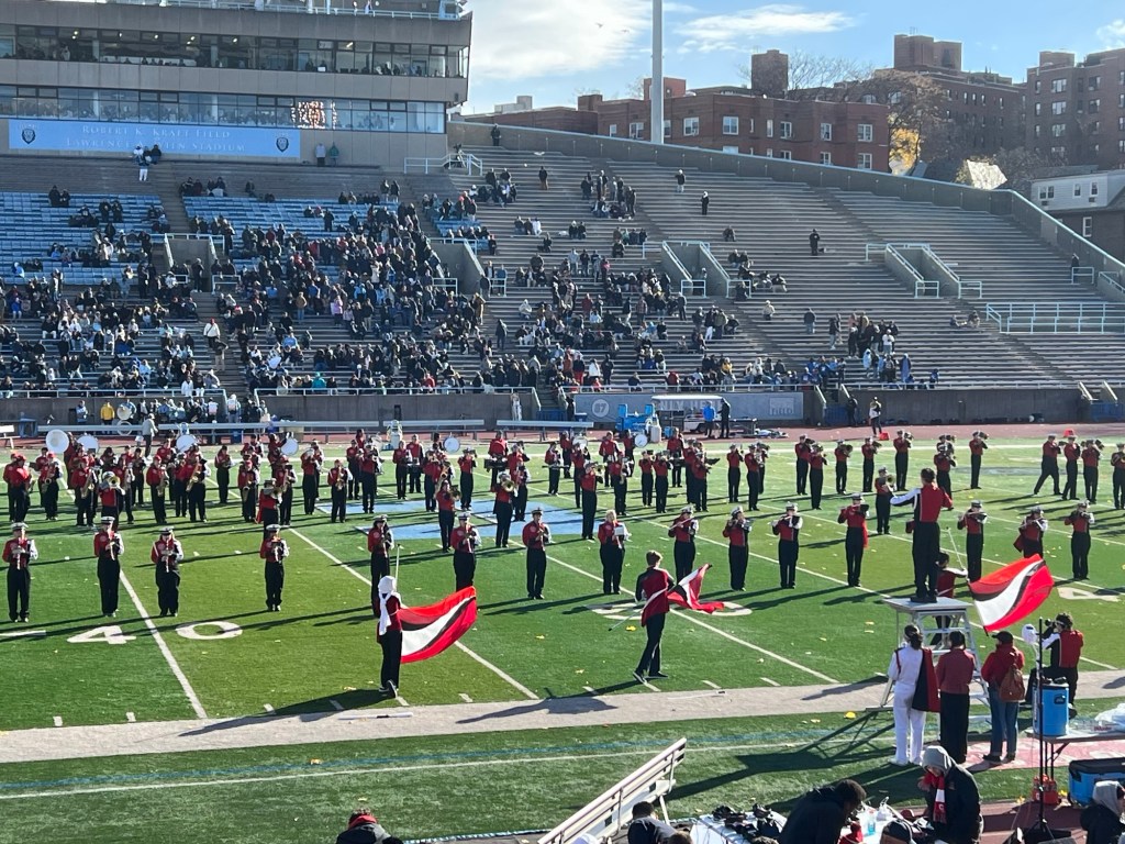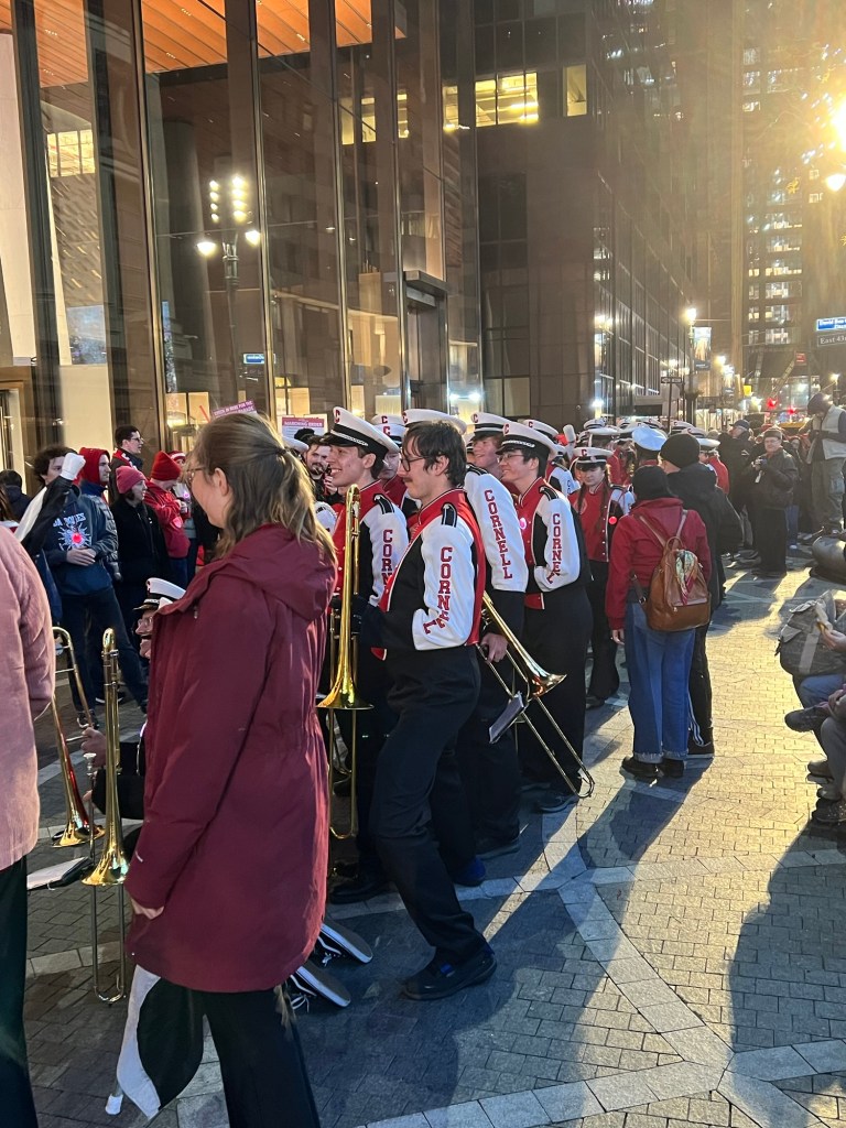 The Cornell Marching Band preparing for the parade from Vanderbilt Avenue