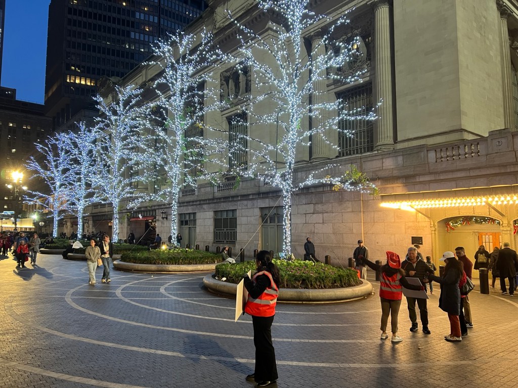 When I got to the club, I found out that they had to change the route of the parade due to permit problems and we started in front of One Vanderbilt Avenue between Grand Central Terminal and the office building in the plaza. It was funny to hear that somehow the two busses of band members and alumni heading back to campus got lost somewhere in New Jersey and had to head back into Manhattan. So, the rest of the alumni had to wait in Vanderbilt Plaza in the cold until they arrived about a half hour later. Then the fun began.