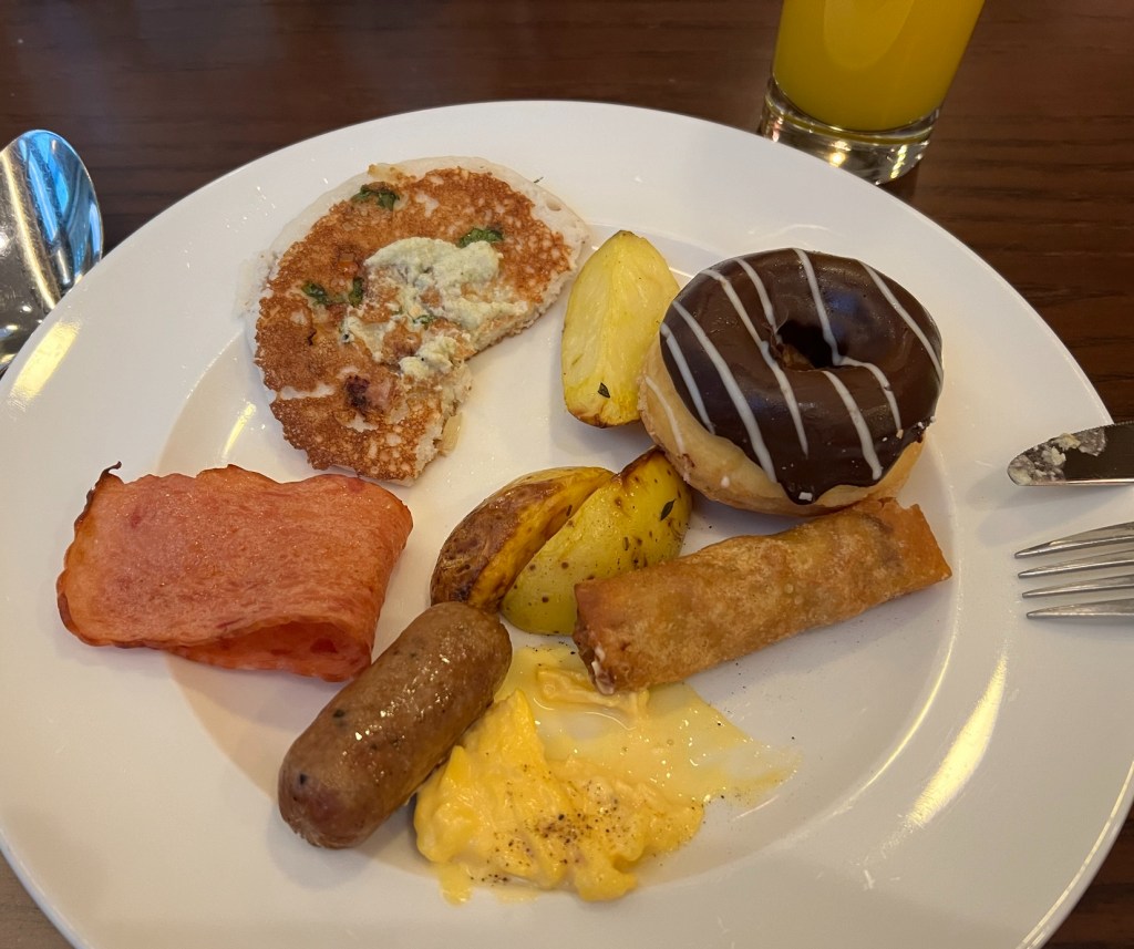 The buffet breakfast sausages, bacon and Spring Rolls.