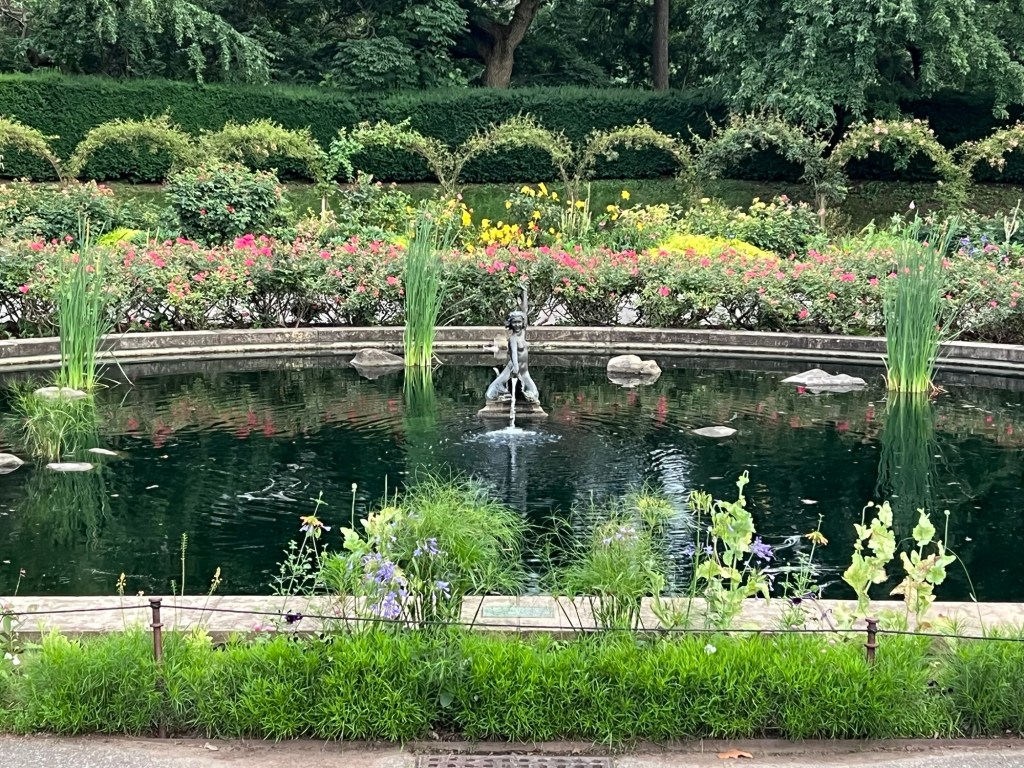 Admiring the Rose Garden fountain just south of the Cherry Blossom lawn.