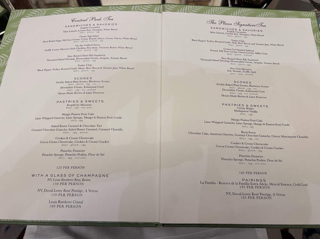 I had not had Afternoon Tea at the Plaza since 1994. I remembered this because it was just after ‘Home Alone II’ was released and everyone was talking about the hotel and its iconic lobby. I remembered the elaborate cakes and sweets and the perfect service. I also remember it being around $85.00 back then. Since that time, The Central Park Tea is now $145.00 and The Plaza Imperial Tea is now $155.00. The times have changed.