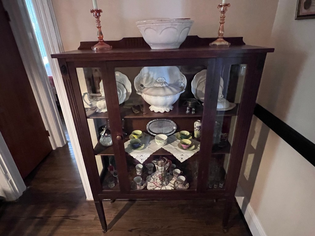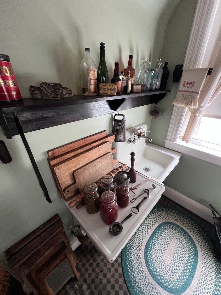 This was another task to bring income to the household. Maria used the sewing machine to make clothes. The table reflects a setting for the family and ‘boarders’, placed with dishes, silver-plated utensils and a condiment set.