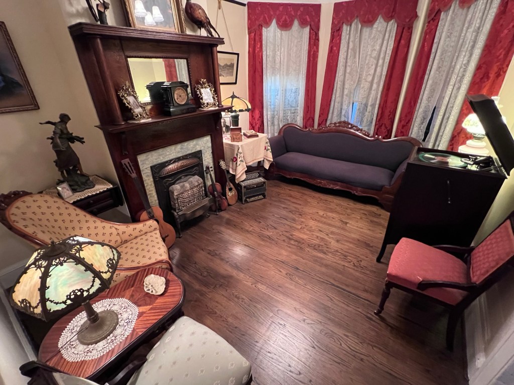 The most formal room in the house, the parlor was used for guests, weddings and wakes. Dominating is the oak mantle with its columns and mirror top. It surrounds a fireplace where, in the winter, a gas heater was attached to a pipe behind the hearth. The clock had to be wound every day and chimes on the half-hour.