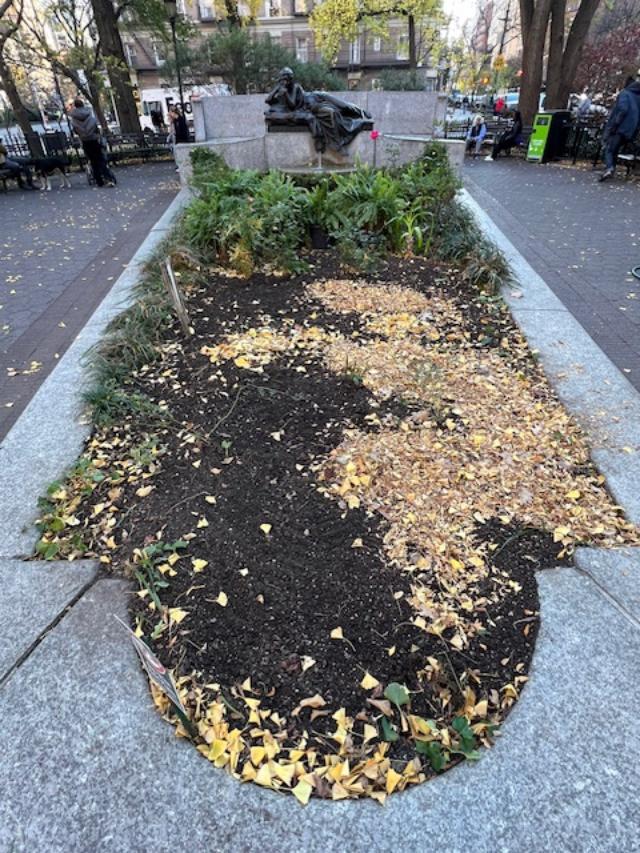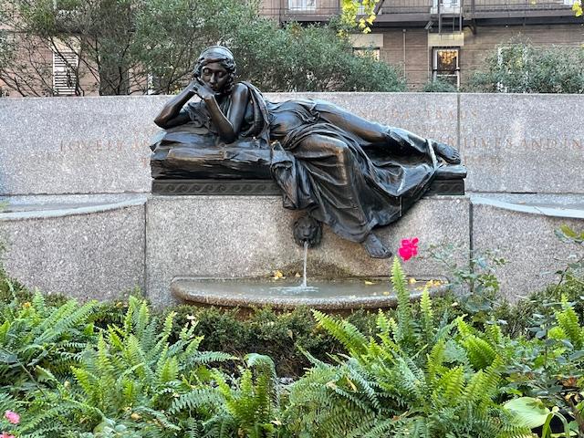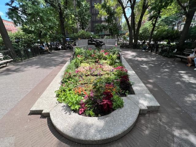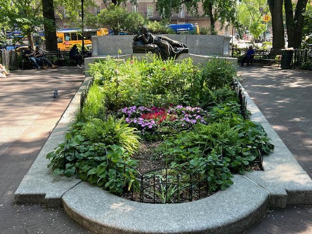 This graceful park is lined with trees, flowers and bushes and is beautifully landscaped to match the Broadway Mall across the street. There are lots of benches to relax in and the park is well maintained by the neighborhood. The four days I spent in the neighborhood there was always someone weeding, pruning or watering something. It is a nice place to take a book or get some writing done. Many of the residents socialize here and it is a nice gathering place. The memorial dedicated to the two of them is simple and graceful and fits into the park nicely.