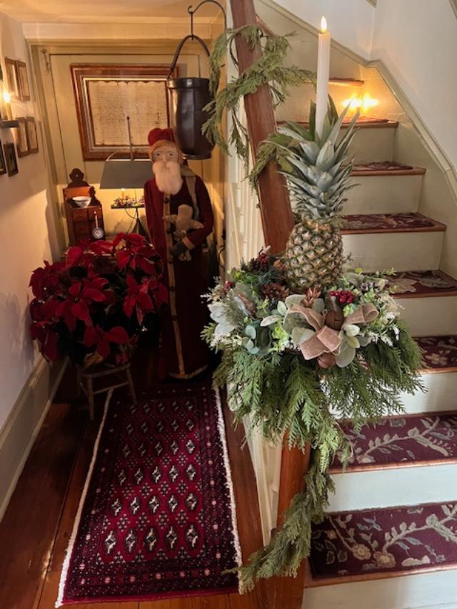The narrow stairs lead to the upper bedrooms and the attic loft.