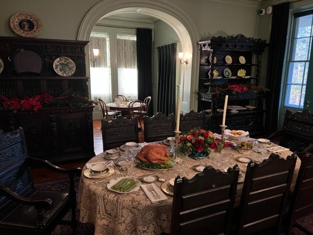 The house was decorated for the Victorian Christmas holidays a big difference from the year before when its them was a ‘Depression Christmas’. The house was nicely but sparsely decorated that year reflecting the times. Here it was all garland on the banisters and archways and set for a formal Christmas dinner.