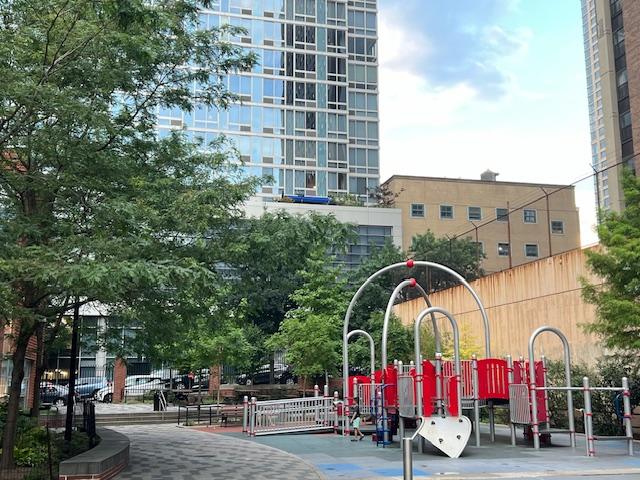 What stood out to me was right smack in the middle of these two complexes and that was Tom Otterness Playground at 630 West 42nd Street. This space of green reminded me of the creativity in playground design that I had seen earlier in Waterline Square Park. Combining small space with creative design to produce a whimsical park for families. It was such a nicely landscaped park and a relief from the heat. I loved the beautiful and artsy playground which is a testament to Tom Otterness’s approach to playground design.