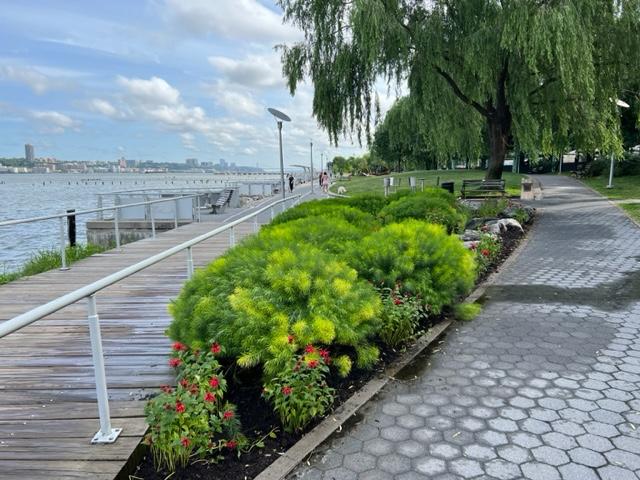 Waterline Square Park is one of the most unusual parks that I have seen in the City since walking Battery Park City. The park has almost a Dr. Seuss effect to it with its interesting plantings, bridges and water features in all directions. It also has plenty of seating to relax and enjoy the cool breezes. All this packed in between three elegant buildings. It was fun just watching everyone have a good time.