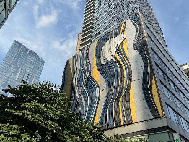 Walking across the street, I was greeted by the beauty and elegance of the new complex, One Waterline Square, which was behind fencing the last time I visited the neighborhood. The finished complex was simmering in the sunlight and in the middle of the complex is the energetic Waterline Square Park.