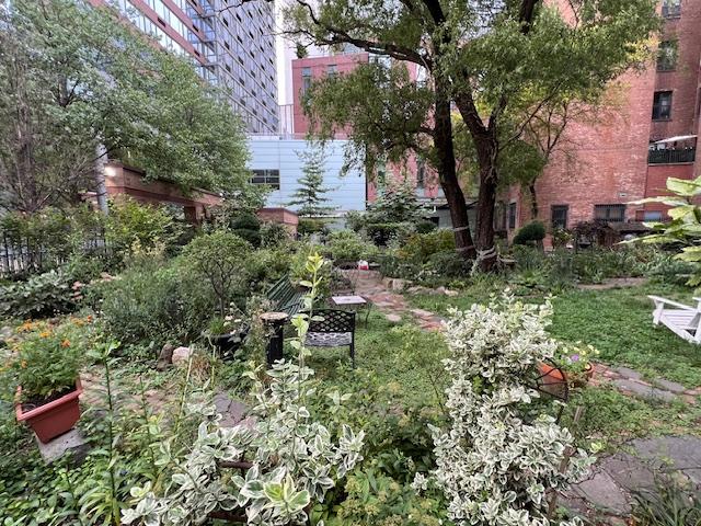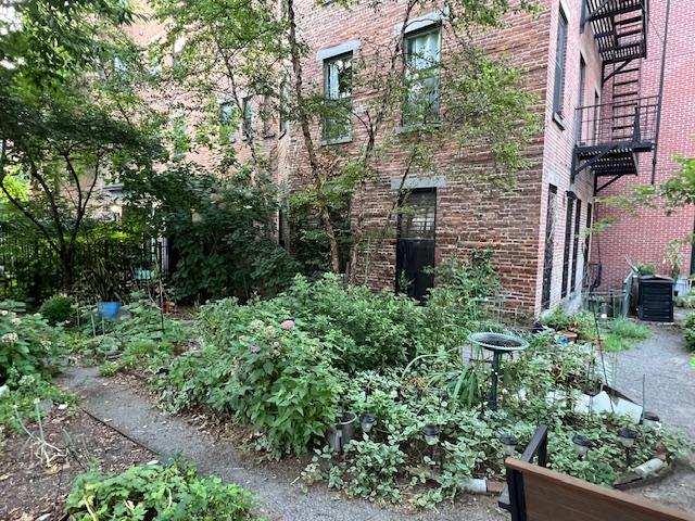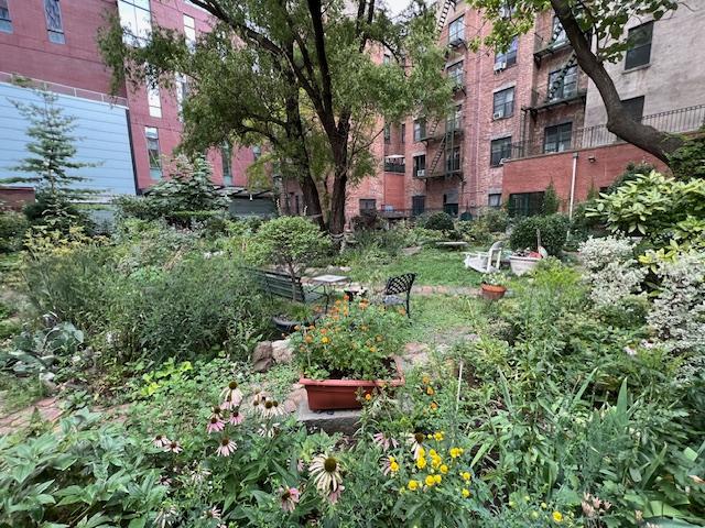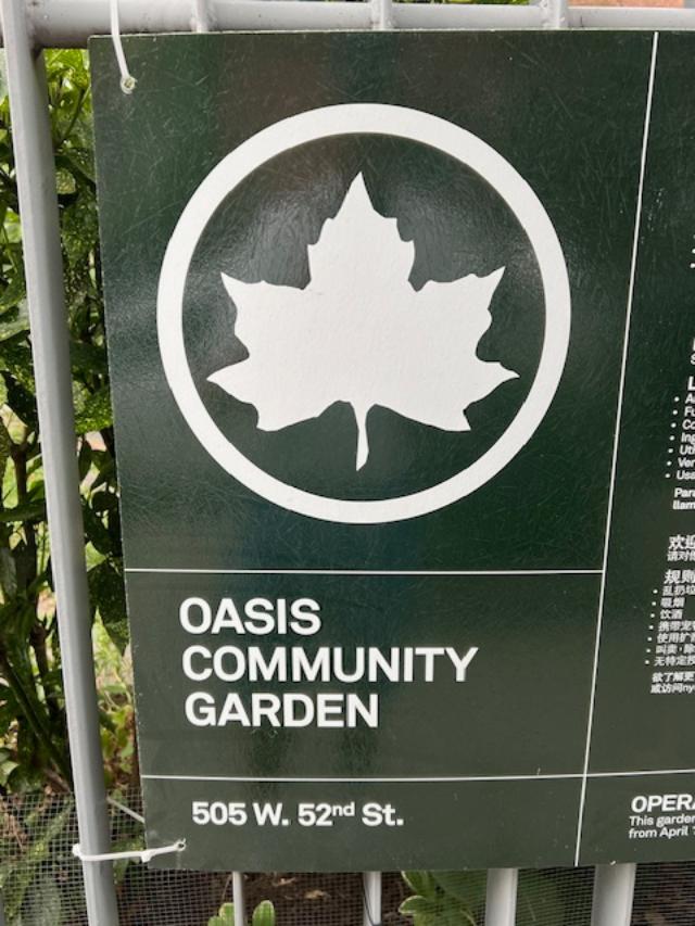 The garden is attached to an old tenement housing 565 West 51st Street with the interesting carving “St. Mary’s 1887” on the top. This is now affordable housing.