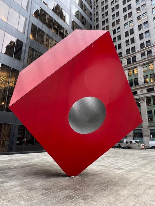 Across the street from Zuccotti Park in the plaza of the Brown Brothers Harriman Building is the sculpture “Red Cube” by artist Isamu Noguchi. This interesting sculpture stands on one edge of the cube.