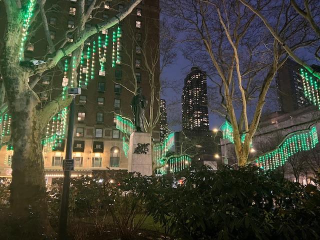 Zuccotti Park at twilight at Broadway and Cedar Streets