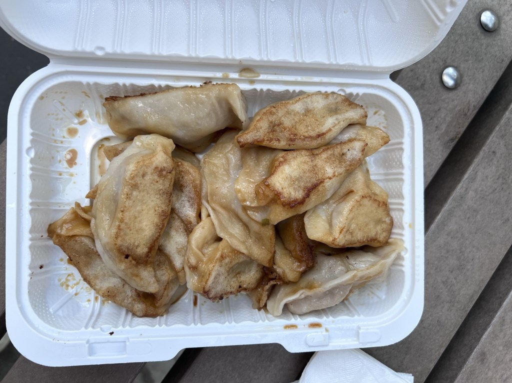The Fried Dumplings here are excellent and there is a nice park around the corner to eat