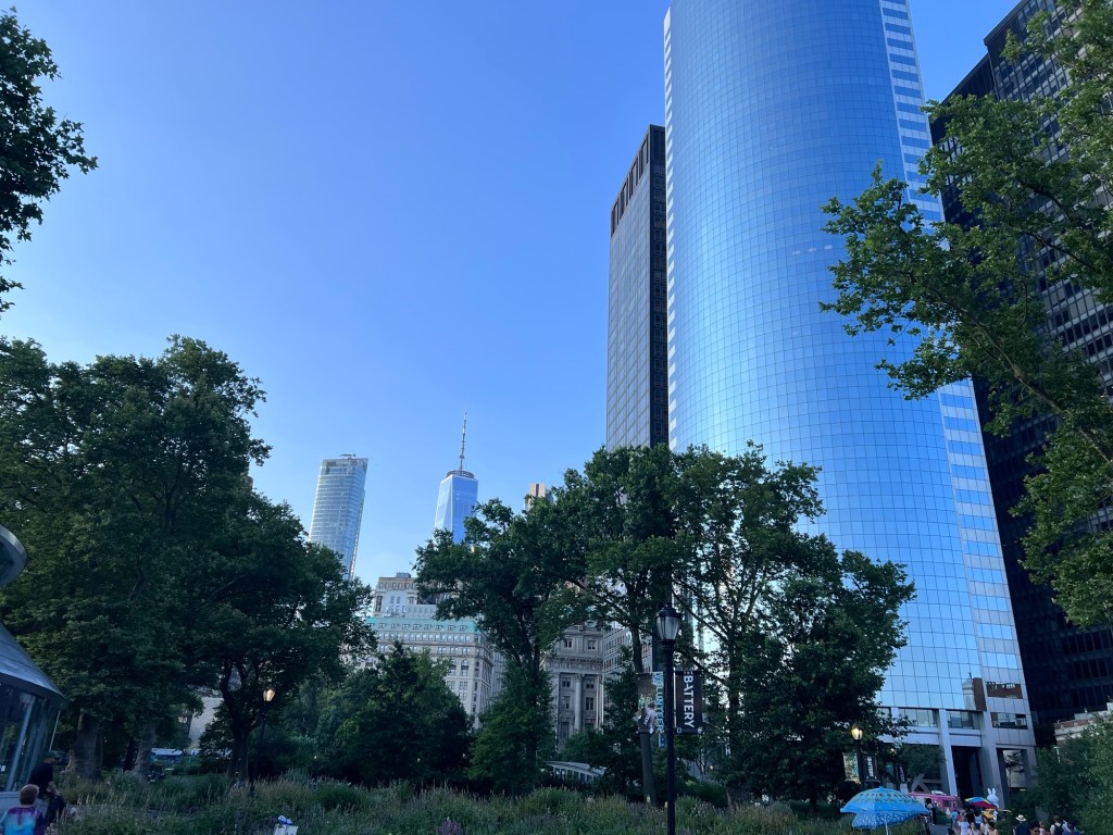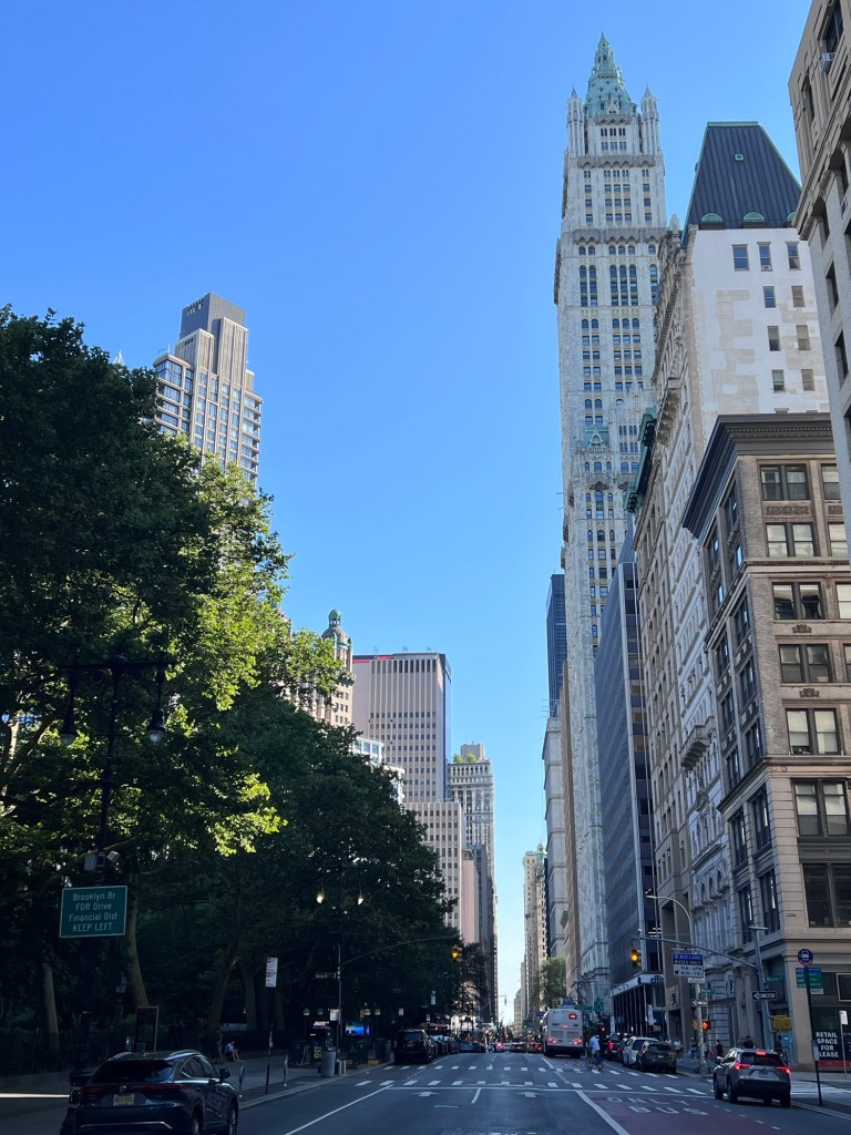 The end of Broadway by Bowling Green Park in the Spring of 2024.