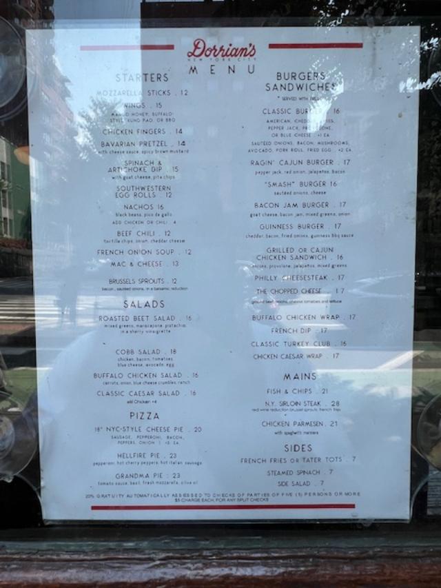 Dorrian’s current menu in the Summer of 2024 (the UES Burger is no longer on the menu)
