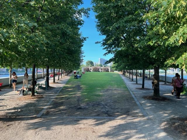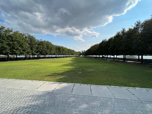 Our first part of the tour was visiting the new Cornell Tech campus on the southern part of the island. This new complex of four buildings is the wave of our university’s urban campus to soon be joined by a new hotel and another tech building (both opened and operating in 2022). The area has been replanted and a new lawn and gardens has been built on a waste deposit site. It’s hard to believe that it is built on a trash mound.