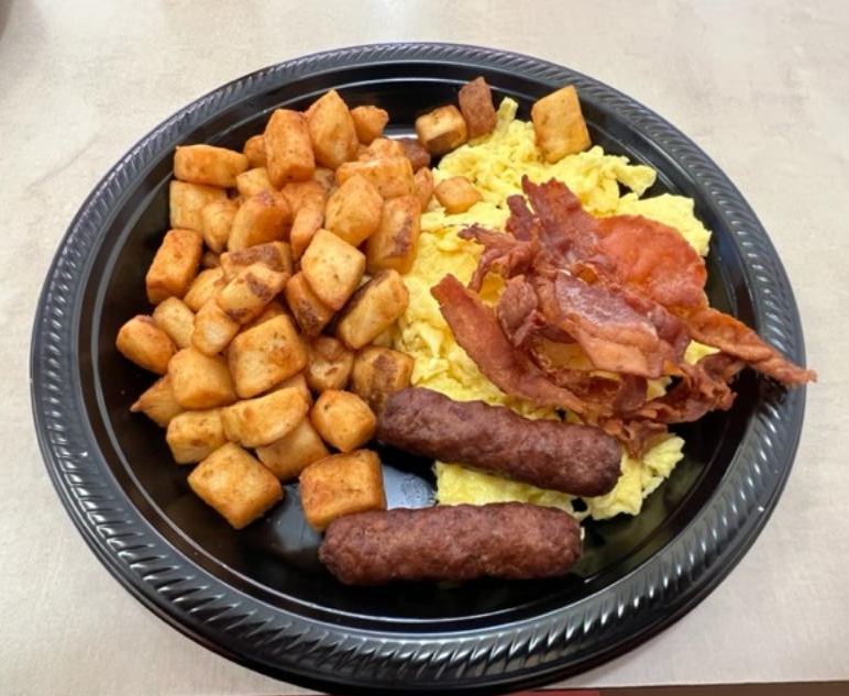 My breakfast, the Chalfonte Breakfast with scrambled eggs, bacon, hash browns and toast