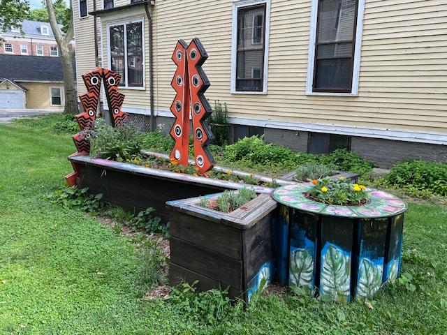 In the Liggett Hall archway, his sculpture ‘Never comes Tomorrow’ contains hundreds of wooden cubes and two massive steel funnels which showcases the artists interest in architecture. To me I found it whimsical and fun showing a combination of a work straight out of ‘Alice in Wonderland’ or ‘The Phantom Tollbooth’. It looked like a series of trumpets with the communication devise in the middle of the structure. Hurry though, these sculptures I read online will only be up until Halloween.