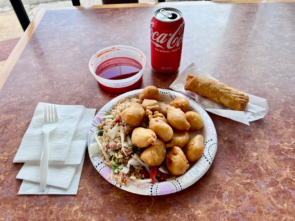For lunch one afternoon, I ate at Wah Yan Kitchen at 601 Main Street. This little hole in the wall take out restaurant services delicious Cantonese food at very reasonable prices for lunch. The afternoon I was there I had a Shrimp Lo Mein with a side of Pork Fried Rice and an egg roll.