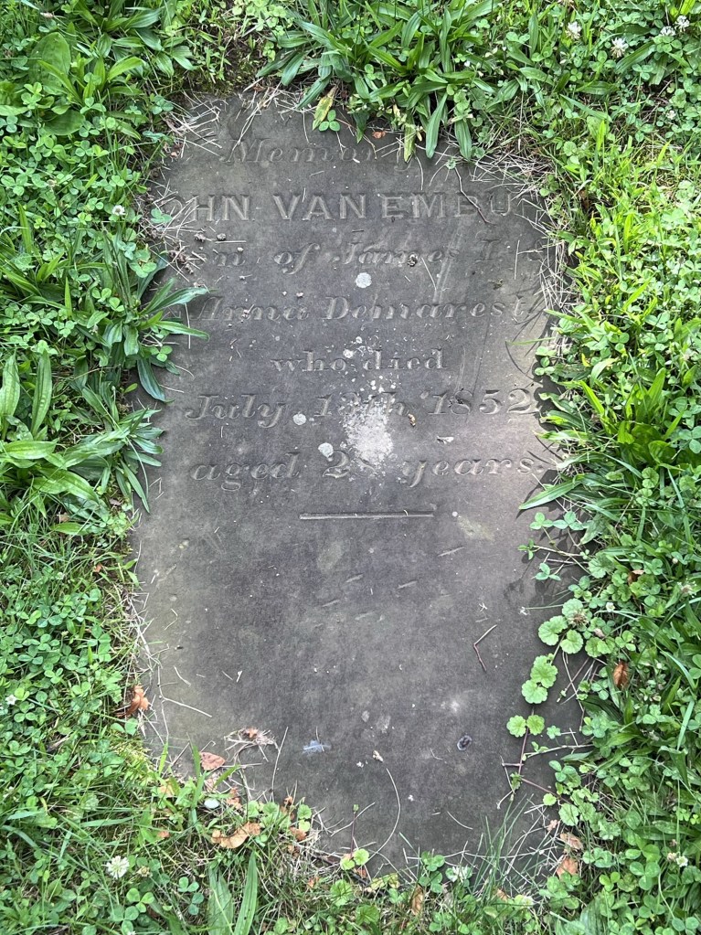 The grave of John Van Embury, whose wife was a member of the Demarest family.
