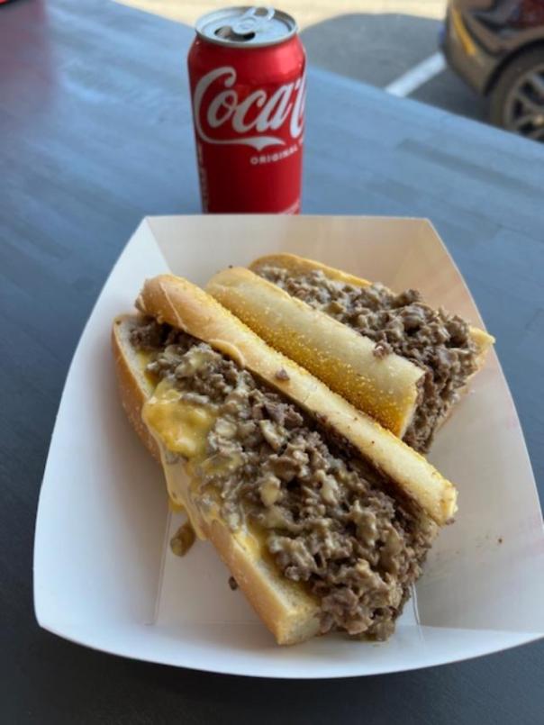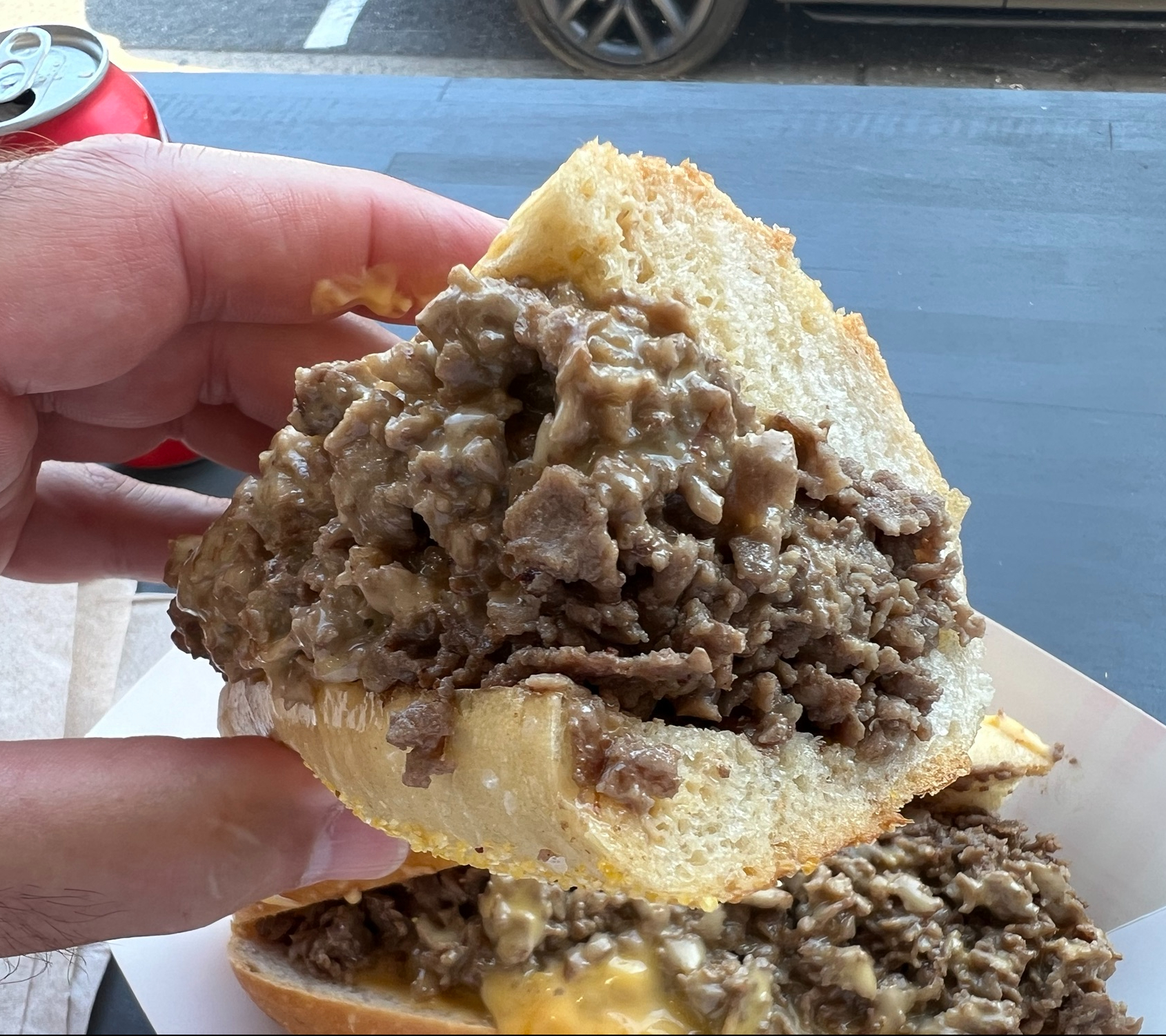 The food was excellent. I had the traditional Cheesesteak with Wiz (Cheese Wiz) on a chewy hero roll. The thin steaks were piled into the bun and loaded with the gooey cheese mixture.