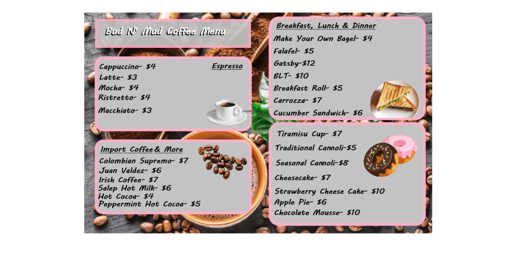 So chapter by chapter we built the store from ground up. First I had each student create a logo for their store, then we moved on to the menu of the items that they each wanted to carry in their store, then we moved to store design and layout, where they had to show me how the flowers were going to combine with the food and beverages.