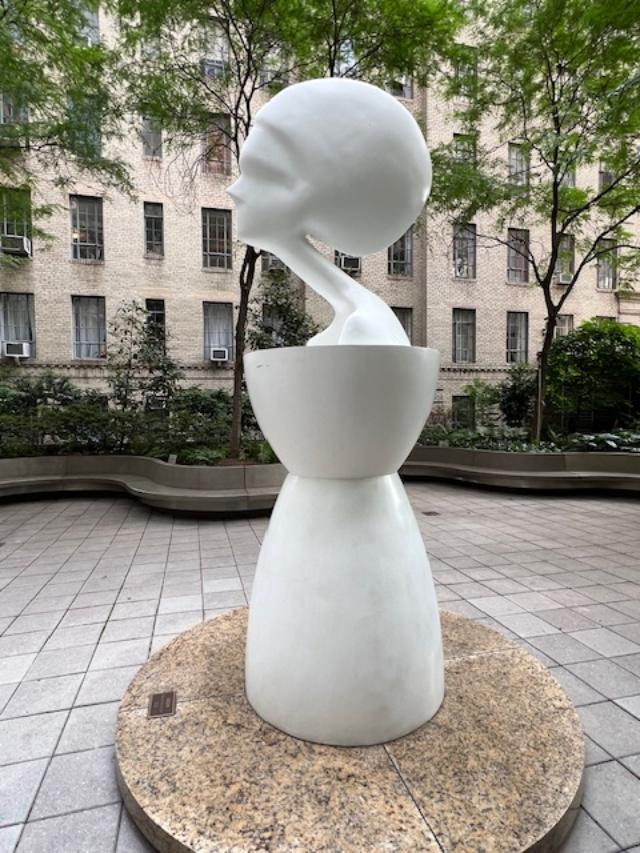 When walking back up north on Sixth Avenue at the corner of West 55th Street is artist John Rennert’s sculpture, “Listen” on the spot where the well-known “Love” sculpture used to be.