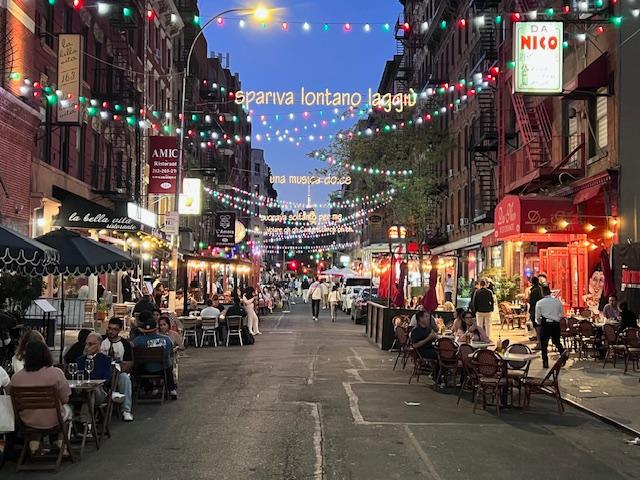 Little Italy Manhattan along Mulberry Street at night in 2025