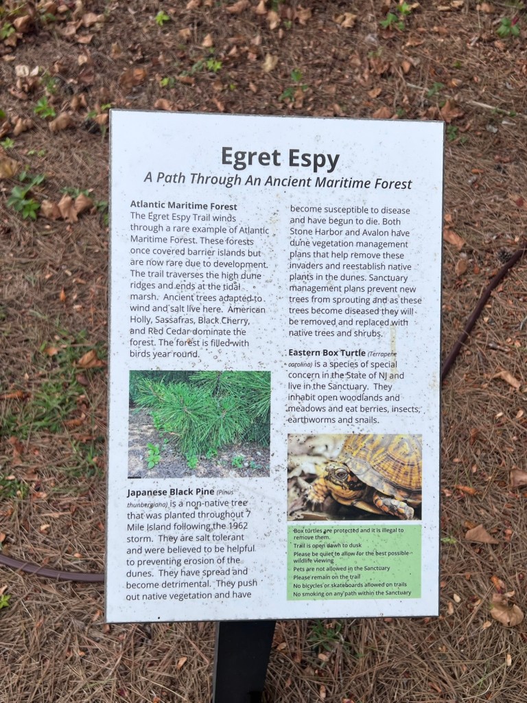 I took a walk when I was in Stone Harbor through the town’s Bird Sanctuary to hopefully view some rare birds. While I did not see much, I heard a lot of singing and scrawling as I walked the path through the trees.
