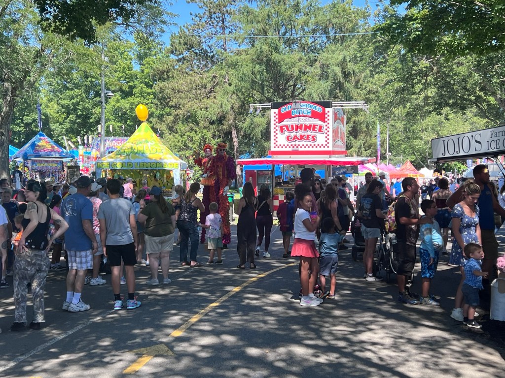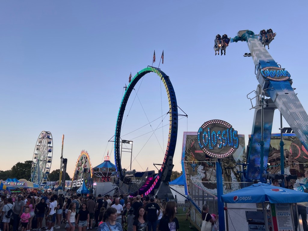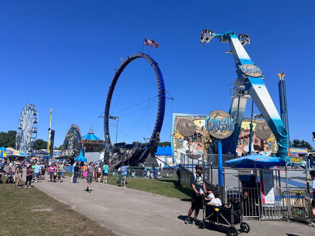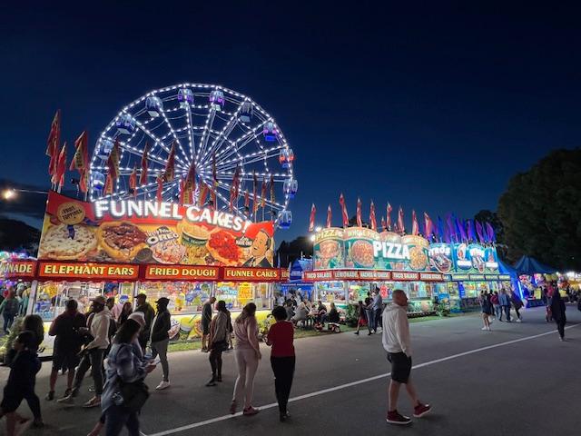 The Ferris wheel dominates this section of the fair surrounded by smaller rides and lots of dessert stands.