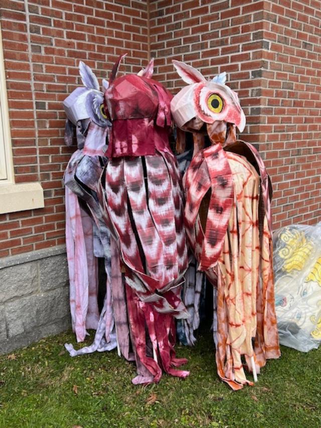 We unpacked the ballerina, Mother Earth and various bees, penguins, turtles, horses and this year’s mascot, the Owl. All the other animals had made appearances in the parade in other years when they were the mascots. I remember last year when we put the bees together for the parade. We put all the final touches on each of the puppets and the floats that needed extra parts added to them.