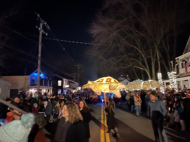 There is an exhilaration when the parade progresses down the hill into Downtown Rhinebeck and the whole town is lit with white Christmas lights and illuminated stars that represent the parade. It may have seemed quiet in town that afternoon but the crowds were out for the parade. There must have been about a thousand people lining the street on both sides. It was a big crowd filming the parade.