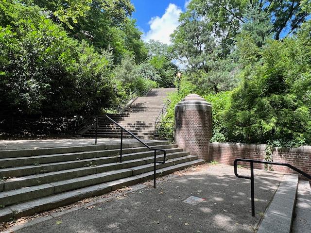 My recommendation is go to Victorio’s Pizza and get it to go and eat it in Jackie Robinson Park. The middle of the park has benches to sit on and the park is really pretty with its slopping walkways and rock work and it’s large trees to sit under.