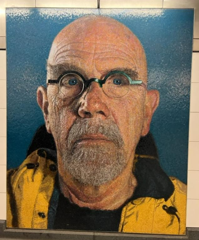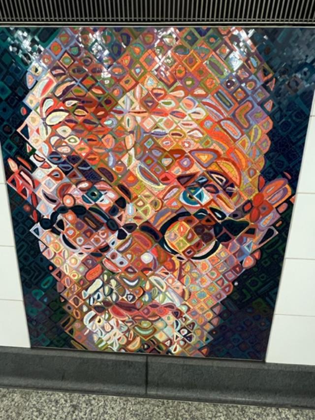 At the 86th Street stop you will be dazzled by the artwork of one of my favorite artists, Chuck Close. I had marveled at his artwork when I lived in Chicago at the Contemporary Museum. You always know his work by the powerful real life images that he presents. He created 12 large-scale works that spread throughout the platforms. Really look at the artwork and you will see that they are made of tiny mosaic pieces.