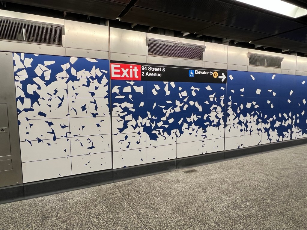 This creativity starts at 96th Street as you enter the subway with a combination of steel and blue lights and take the escalator down a futuristic tunnel down to the platform and you gaze upon the artwork of artist Sarah Sze. When you see the work from the subway platform, it almost looks like flying papers outside. When you walk the whole platform, you see what she is trying to achieve.