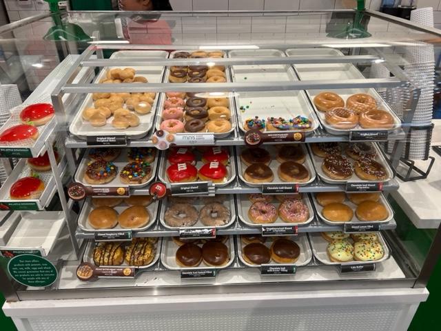 The freshly made doughnuts at Krispy Kreme are for sale and are delicious.