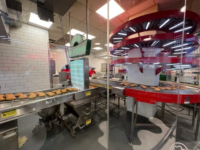 Inside of Krispie Kreme flagship store making the fresh doughnuts. You get tempted with all the icing being doused on the doughnuts.